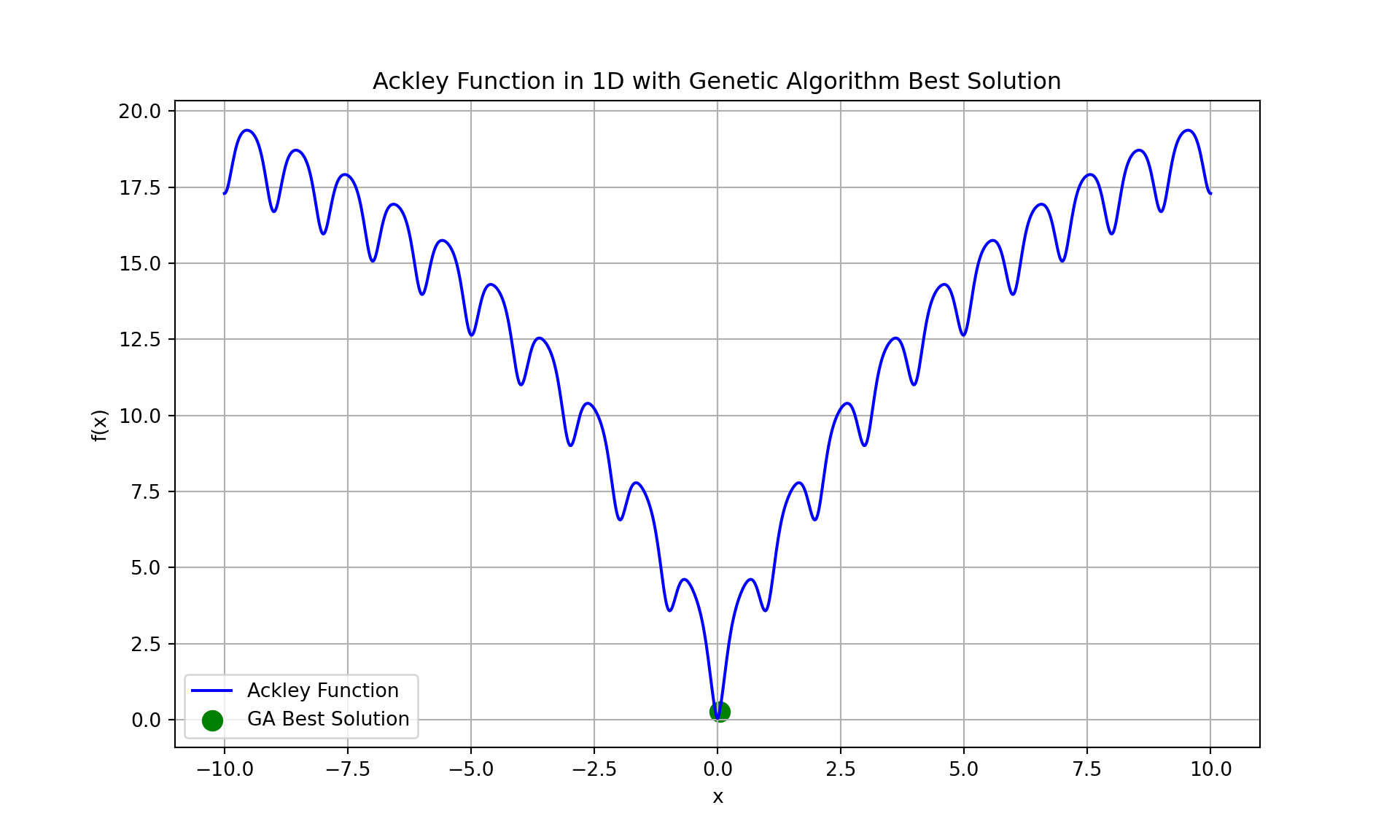 plt.title("Ackley Function in 1D with Genetic Algorithm Best Solution")