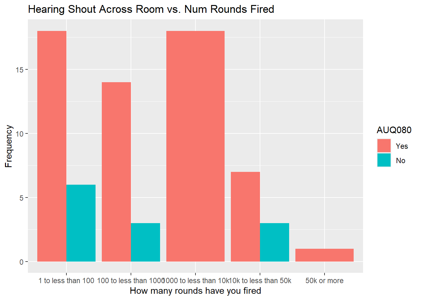 labs(x = "How many rounds have you fired", title = "Hearing Normal Across Room vs. Num Rounds Fired",